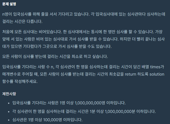입국심사를 기다리는 사람 수 n, 각 심사관이 한 명을 심사하는데 걸리는 시간이 담긴 배열 times가 매개변수로 주어진다.