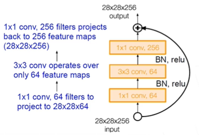 bottleneck : 1*1 conv를 통해 feature 크기를 바꿔준다.(googlenet과 유사)