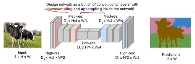 => downsampling -> upsampling -> softmax => loss를 줄이도록 학습