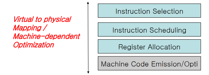 machine이 제공하는 instruction set에 맞게 적절한, 빠른, 효율적인 option을 만들어내는 것이 instruction selection이다.