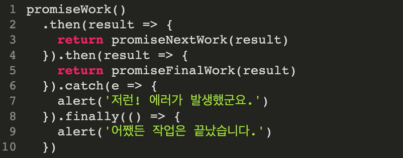 promise로 정의된 작업끼리는 연결할 수 있으며, 이를 통해 코드의 depth가 크게 증가하지 않는 효과가 있다.