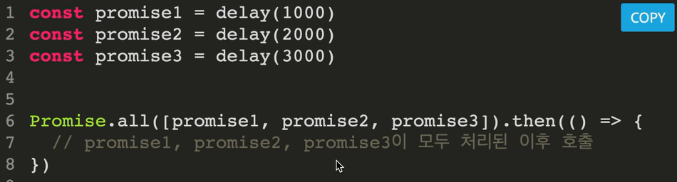 Promise.all(iterable) : 여러 promise를 동시에 처리할 때 유용