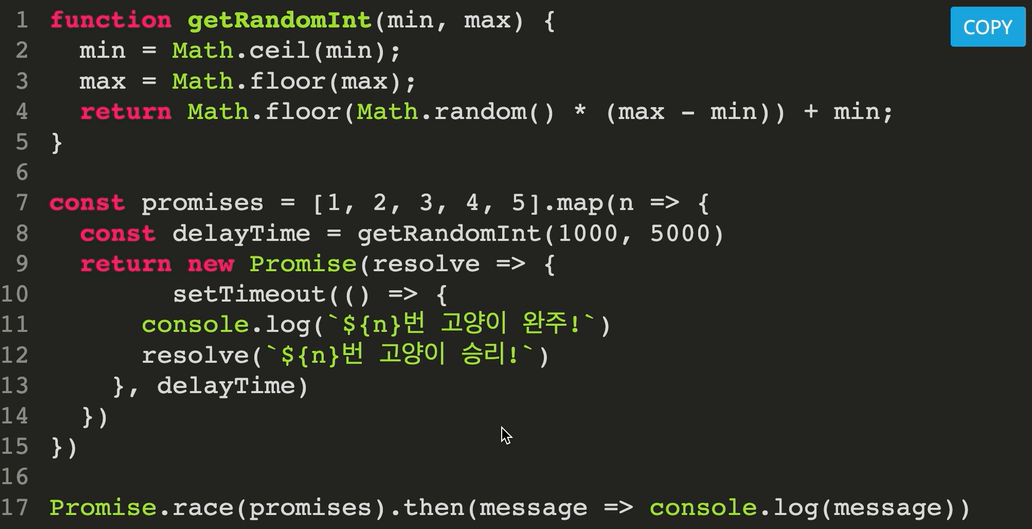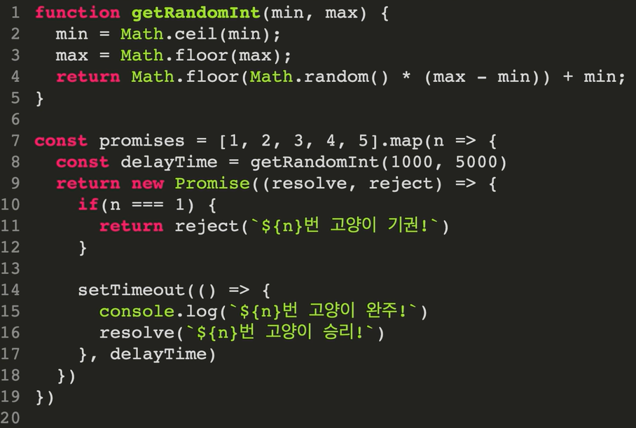 Promise.race(iterable) : 여러 promise 중 하나라도 resolve 혹은 reject되면 종료