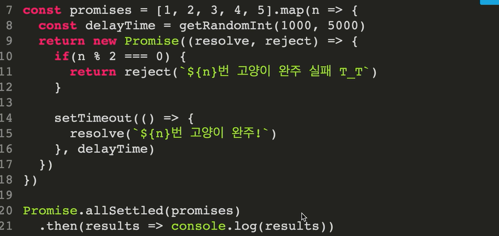 여러 promise들이 성공 / 실패 상관 없이 모두 이행된 경우를 처리할 수 있다.