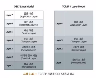네트워크, 인터넷, 전송, 응용의 4계층으로 구성된다.
