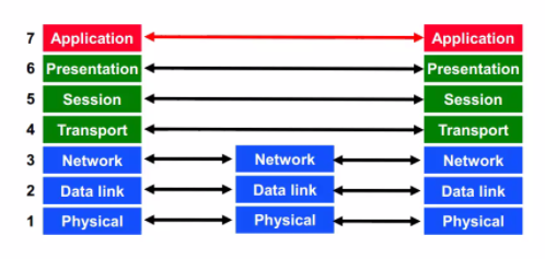 물리, 데이터링크, 네트워크, 전송, 세션, 표현, 응용 계층으로 이루어짐